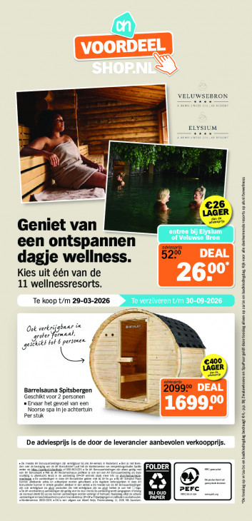 Deze tekst wordt automatisch gegenereerd, dus deze kan fouten bevatten.m ed VELUWSEBRON rer MELLNES: t RESORT ss En N J ELYSIUM er Es in er fe, A — €26 LRGER „sore Geniet van entree bij Elysium of Veluwse Bron een ontspannen adviesprijs 52° dagje wellness. Kies uit één van de 11 wellnessresorts Te koop t/m 29-03-2026 Te ver: Iveren t/m 30. 026 Oot vert baar in roter fr rmaaf, ó personen. geschitt tot L, LAGER dan de adviespris 20997 Barrelsauna Spitsbergen Geschikt voor 2 personen _ = Ervaar het gevoel van een Per stuk Noorse spa in je achtertuin De adviesprijs is de door de leverancier aanbevolen verkoopprijs. an at de bamgrg an de À Boss De messe 4 Emussanbatgen 2h var ate jr m eernd. Ban je net ke de antennen verige Sort FOLDER Ben el amant» et de Famenne De Ai Sinusambisingen zn den geg met. (nk an an A Done a deze Fc omis voarfg 5 vbakant, eren de ar 02 zuikcdngen n deze AH Brise gaden nt 3 At ga „I Schanol Pa a mee LA én) ono Buste kannen n avan gean awe can wave «Demande van de ft Banned Kmer panda ant an acher warn genade. „De egte veracpongen in ders A en m aa gnome 2h où eee ve à naald aen he an De rares Ann ambre zi gag aarden 1 m are zn ua ambang moet anggar cf (de cel ws BIJ OUD PEFC mana mines GO. «DK à œen atgae a Met HN Poe deu I meeneem opslaan Pe pe Ronan Zand. N: pong “De toeslag op wr/za/z0 en badkledingdag bedraagt €4,- pp. Bi Zwaluwhoeve en SpaPuur geldt dezetoeslag alleen op za/zo en badkdedingdag Kijk voor alle deelnemende resorts op ah.nl/bewellness