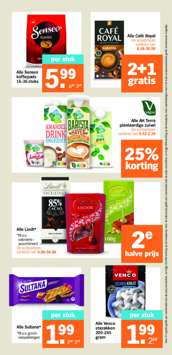 Deze tekst wordt automatisch gegenereerd, dus deze kan fouten bevatten.ensec CAFE ROYAL Alle Café Royal [LE per stuk @ Alle Senseo koffiepads et, 16-36 stuks fr Alle AH Terra BARISTI plantaardige zuivel IS BARS JS scan €) aire À @ $ gi FX Ko Lö DU inch EXCE K CACAO A eZ I 5 Mr Alle Lindt* RICH DARK “Mu. seizoens. ID assortiment ng > SULTAN, oa @ “ LOT AE LT LS Alle Venco Alle Sultana* stazakken *Muv. groot- 200-245 verpakkingen gram Voor 241 gratis geldt: per combinatie kan de prijsverschillen. Je krijgt 33.34% korting op de totaalprijs. Voor 2e halve prijs geldt: per combinatie kan de prijs verschillen. Je krijgt 25% korting op detotaalprljs. Voor aanbiedingen met 2 of meer productvarianten geldt: combineren mogelijk.