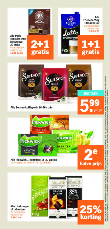 Deze tekst wordt automatisch gegenereerd, dus deze kan fouten bevatten.AN Alle => Friesche Vlag Friesche 140-1000 ml Via; AL > el ij 1 Alle Perla capsules voor le Nespresso 20 stuks C0 ense C2 Se EXTRA ensec SL NG CLASSIC eos ; 36 COFFEE PAL ET per zak NS CA 36COFFEEPADS. Jekrijgt 33.34% korting op de totaalprijs. Alle Senseo koffiepads 16-36 stuks l AW ET OT fi | EN 5 RE Alle Pickwick 1-kopsthee 15-20 zakjes t 25% korting op de totaalprijs. Voor aanbiedingen met 2 ofmeer productvarlanten geldt: combineren mogelijk | Ld A CELLENCH IKCELLENCI 85% CACAO AN | Alle Lindt repen of tabletten NOIR RICH mark 7 nn. Voor 1+1 gratis Voor 2e halve prijs geldt per combinatie kan de prijs ver: