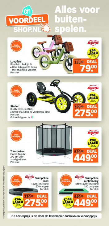 Deze tekst wordt automatisch gegenereerd, dus deze kan fouten bevatten.VOORDEEL — BERG à ih ? Loopfiets ar DEAL Biky Retro, leeftijd 2+ 2 = Ultra lichtgewicht frame 00 met stuurtasje van leer Per stuk IAS CS BERG bezorging } pr Ô Skelter ) DEAL Buddy Cross, leeftijd 3+ = Groeit mee door de verstelbare stoel 00 Per stuk 275 Ook verkrijgbaar in: > u | BERG 1 | Trampoline DEAL Favorit Regular 270 cm Grey 00 + veiligheidsnet 449 Per stuk BERG ws zo Trampoline CS HERE Trampoline rond bezorging rechthoekig Favorit InGround Ultim Favorit InGround 200 cm grey Per stuk 280 cm green Per stuk DEAL 2750 449°° Detrampolines, skelter en loopfietsen worden verkocht door Berg Toys BN. De adviesprijs is de door de leverancier aanbevolen verkoopprijs.