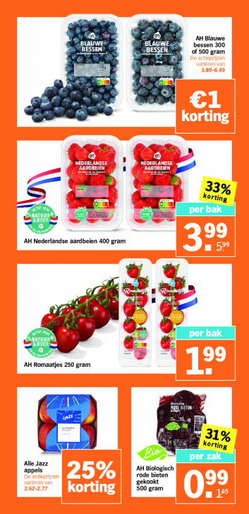 Deze tekst wordt automatisch gegenereerd, dus deze kan fouten bevatten.@ AH Blauwe CRAQUE bessen 300 [8 SH of 500 gram we ci = En Re A on = 13 ! u IE 33 E korting CCI COUT per bak &BOER X a res AH Nederlandse aardbeien 400 gram Cl A kl CA rn zj ER Voo COUT QÙ &BOER 07 lj © ae” Eu AH Romaatjes 250 gram . ER AN RQUE BIETEN Mu Er 31 korting Alle Jazz AH Biologisch appels rode bieten gekookt 500 gram