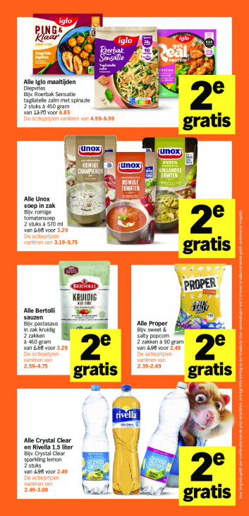 Deze tekst wordt automatisch gegenereerd, dus deze kan fouten bevatten.TE = PING: Kl Reerbak N, KO Ee LS di Alle Iglo maaltijden Diepvries x Bijv. Roerbak Sensatie tagliatelle zalm met spinazie 2 stuks à 450 gram van 13-70 voor gratis Fr Je A uno 1 ES (UT En unox til > N te ES 5 Na Alle Unox soep in zak 3% Bijv. romige tomatensoep E En 2 stuks à 570 ml van 658 voor 2° gratis lts VpROPER KRUIDIG — [es AE ENDE Alle Bertolli sauzen mt 130 Bijv. pastasaus Alle Proper s' in zak kruidig | Bijv. sweet & 2 zakken salty popcom à 460 gram 2 zakken à 90 gram van 658 voor van 498 voor ge 2° gratis gratis = Wi Alle Crystal Clear dm en Rivella 1.5 liter ET Bijv. Crystal Clear parkling lemon Crystal 2 stuks a} fl OEE) van 498 voor étosr ge a (7 Ve. zeef. gratis