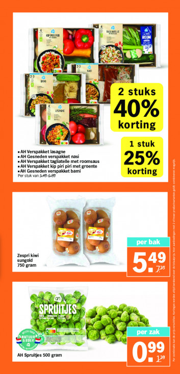 Deze tekst wordt automatisch gegenereerd, dus deze kan fouten bevatten.D raGLATELE PIR ROOM EDE A) | NASI BAM > 2 stuks ES LASAGNE 40% el korting Bà Pr 1 stuk = AH Verspakket — =AH Gesneden verspakket nasi = AH Verspakket tagliatelle met roomsaus 25% = AH Verspakket kip piri piri met groente =AH Gesneden verspakket bami korting Per stuk van 549-689 di » a A. À 1 1 = $ sungold Zespri kiwi 750 gram SA En $ LA Se CEE am nn + ik >€ C UML COLA &BDER 67 GR AH Spruitjes 500 gram