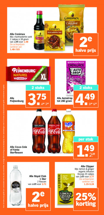 Deze tekst wordt automatisch gegenereerd, dus deze kan fouten bevatten.\ IMEeX ke Con De AV de _ Conimex Fa LR Alle Conimex [ Conimex Le Bijv. marinademix saté v à 2 zakjes à 38 gram = van 198 voor CADILLACS rl L NBUF Pa FA 3 LE à Alle Alle Autodrop Peijnenburg tot 280 gram lk FANTA NE | N] 7 | {| Alle Coca-Cola dee of Fanta literflessen Fet Alle Clipper Bijv. lemon & ginger organic infusion Doosje 20 zakjes Alle Royal Club van 369 voor 1 liter 2 flessen ROYAL van 498 voor ag dr LEMO] & GING IF Sr