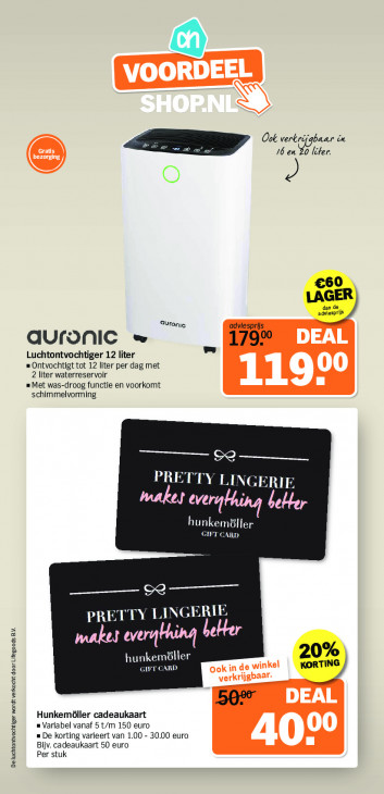 Deze tekst wordt automatisch gegenereerd, dus deze kan fouten bevatten.Ook verkrijgbaar én 16 en liter. ee O €60 LA GER adviesprijs =) vronie adviesprijs auranic » 179% Luchtontvochtiger 12 liter «Ontvochtigt tot 12 liter per dag met 2 liter waterreservoir = Met was-droog functie en voorkomt schimmelvorming GO EEE di DN D »ERIE beller makes erg hunkemöller GIFT CARD ee ee PRETTY LI UN PA everging beker 0% hunkemöller KORTIN Fela N) 50% Hunkemöller cadeaukaart = Variabel vanaf 5 t/m 150 euro = De korting varieert van 1.00 - 30.00 euro Bijv. cadeaukaart 50 euro Per stuk Deluchtontvochtiger wordt verkocht door Lifegoods BN.