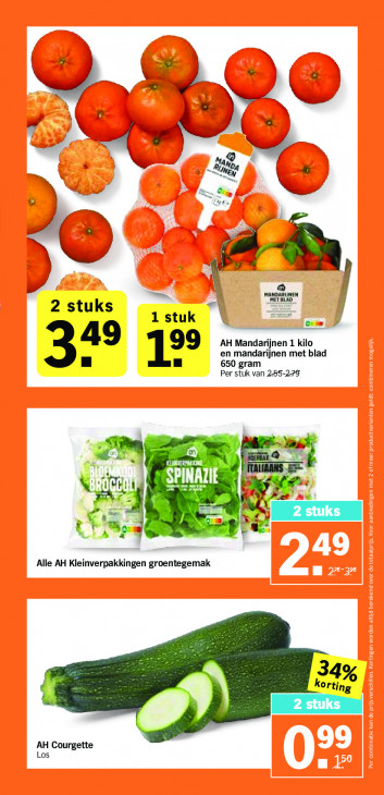 Deze tekst wordt automatisch gegenereerd, dus deze kan fouten bevatten.SE Y: 9 A 7 Ri =" en + a din ie u ) c PANEAEUMEN 2 stuks == oe = 1 Ber % AH Mandarijnen 1 kilo en mandarijnen met blad 349 15 650 gram Per stuk van 255-249 zn IL = NA Ne IE 5 re Gang) te >, Alle AH Kleinverpakkingen groentegemak 3 korting AH Courgette Los