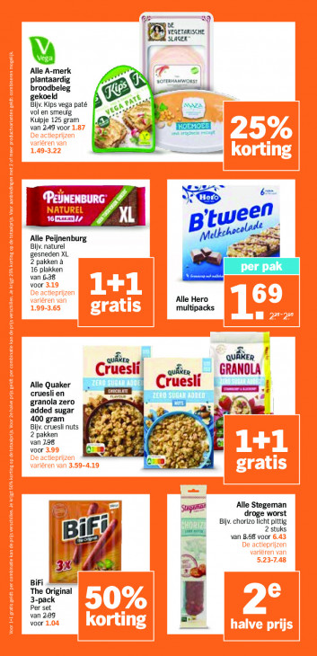 Deze tekst wordt automatisch gegenereerd, dus deze kan fouten bevatten.a rj LE VEGETARISCHE, SLAGER ce Alle A-merk plantaardig In BOTERHAMWERST broodbeleg gekoeld Bijv. Kips vega pat& ar vol en smeuig ok Kuipje 125 gram van 249 voor AL el Ÿ Es 1: B u XL Alle Peijnenburg Bijv. naturel gesneden XL LE re 2 pakken à 16 plakken van 638 voor Alle Hero multipacks un A Cruesli in Ele RANOLA ia len Cru Alle Quaker EEn rer esli menus À cruesli en Ra CETTE ENT granola zero st added sugar Ca 400 gram F4 PR: 7. Bijv. cruesli nuts 4 Werte Eu 2 pakken van 298 ji Fi voor , FR. ee cf = Alle Stegeman droge worst Bijv. chorizo licht pittig stuks i Ei van 8-58 voor wi 3 W BiFi ES The Original 3-pack Per set van 209 voor