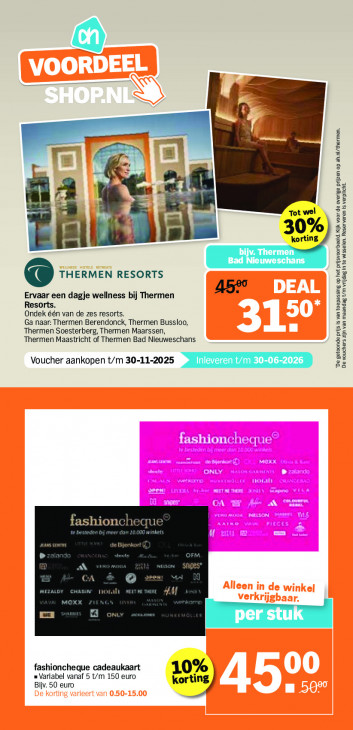 Deze tekst wordt automatisch gegenereerd, dus deze kan fouten bevatten.DE L æ =" i- Tot wel 30% korting bij LEE Bad Nieuweschans © THERMEN RESORTS 457 Ervaar een dagje wellness bij Thermen Resorts. Ondek één van de zes resorts. Ga naar: Thermen Berendonck, Thermen Bussloo, Thermen Soesterberg, Thermen Maarssen, Thermen Maastricht of Thermen Bad Nieuweschans Voucher aankopen t/m 30-11-2025 “De getoonde prijs Is van toepassing op het prjsvoorbeeld. Kik voor de overige prijzen op ah.nl/thermen. De vouchers zijn van maandag t/m vrijdag In te wisselen. Reserveren Is verplicht. fashior zu Le E ñ] (| fashioncheque cadeaukaart = Variabel vanaf 5 t/m 150 euro Bijv. 50 euro ring)