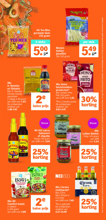 Deze tekst wordt automatisch gegenereerd, dus deze kan fouten bevatten.N Ee ® diek A, À CURE AUS NE | geraspte kaas eg HA 150 gram EAN EM uns, Ri der Le Morjon 4] bakkel- = jauwfilet De Zak 350 gram ESA = 7 | 5 à 4 | Alle H. Nandan NC Cr en Sishado basistomaten- producten* Bijv. H. Nandan re: Bijv. tomato frito Pa roti kip masala Pak 350 gram specerijen van 145 voor 1.01 Le krijgt 25% korting op de totaalprljs. Voor aanbledingen met 2 of meer productvarlanten geldt: combineren mogelijk. 2 zakjes à 80 gram van 258 voor 1.93 2° *M.uv. tomato puree 30% De actieprijzen De actieprijzen variëren van halve prijs variëren van korting 1.48-7.03 0.83-3.07 AH Hot sauce LG habanero Lekker Bekkie of chipotie Potje 145 gram Flesje 150 gram van 299 van 2-69 voor 2.02 voor 2.24 SAUp Zr en gt Cp 25% 25% 5 korting korting gt 50% korting op de totaalprijs Voor 2e halve prijs geldt: per combinatie kan de prijs versch A re) Te GN Alle Corona multipacks* we Bijv. Extra L Set 6 flesjes à 0.33 liter van 9,99 voor 7.49 Alle AH Comfort bowis 2° *M.uv. gekoeld 25% 2 zakken De actieprijzen à 400 gram halve prijs variëren van korting NEUES RR 7:2 4.27-14.99 Voor 1+1 gratis geldt: per combinatie kan de prijs verschillen.