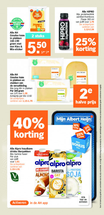 Deze tekst wordt automatisch gegenereerd, dus deze kan fouten bevatten.Alle HiPRO Bijv. proteïnedrink 31 aardbei-framboos = LA = van 239 voor 1.79 Flesje 300 ml ELITE &BDER De actieprijzen variëren van @ RS 1.12-2.24 Alle AH PRO Goudse kaas 2 rn N [ in plakken 25gPROTEINE 160-190 u gram met 25% een Kies & 50 Mix-sticker korting | sou n. GOUDSE48+ Alle AH Goudse kaas ei in plakken en stukken van de versafdeling Bijv. jong 48+ in plakken 8 Per 100 gram a van 1-71 voor 1.28 | Actieprijs per kilo 12.82 De actieprijzen 2° variëren van 1.15-1.79 ä ze halve prijs Mijn Albert.Heijn 0% a 25% ACT ge En D Alle Alpro houdbare LS Us drinks literpakken DNA Bijv. barista haver Per stuk SE van 269 voor 1.61 Je krijgt 25% korting op de totaalprijs. Voor aanbledingen met 2 ofmeer productvarlanten geldt: combineren mogelijk De actieprijzen variëren van alprcalproalpro 1.19-1.91 Ars PROTEINE CHE paRISTA Ro As ED A OAT L u 4 © er Ran But = Klik hier en activeer. in de AH app Voor 2e halve prijs geldt per combinatie kan de prijs verschil