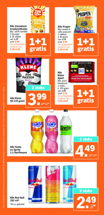Deze tekst wordt automatisch gegenereerd, dus deze kan fouten bevatten.ex PROPER Alle Zonnatura 129 kruideninfusies Alle Proper Bijv. sweet & Bijv. 100% kamille > Wi salty popcom 2 doosjes 2 zakken à 20 zakjes à 90 gram van 548 van 478 voor voor vt TETE Pi tt ter SPORT | « é: Alle Ritter Sport PASSEN Bijv. puur hazelnoot 2 stuks à 100 gram van 438 voor Alle Klene 90-270 gram =] TA FANTA ( FAN cf Er À Alle Fanta en Sprite 1.5 literflessen Va 2 SU 1.3 Alle Red Bull [simon Leto exe one 5 mie 250 ml* Red Bult me | | *Muv. gekoeld