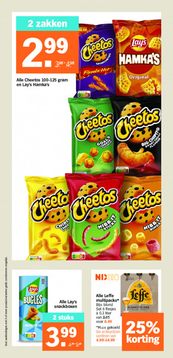 Deze tekst wordt automatisch gegenereerd, dus deze kan fouten bevatten.me We 2 zakken 11 nn | A g or” B Alle Cheetos 100-125 gram en Lay’s Hamka’s RN Ge 6% EX 2 cx se 2 LS 5° A 2 er; de = 22 FA 5 %) je BR ® 2 2 2 AS CS Wa > = Pr > — EC» FT 7 Alle Leffe multipacks* Sefje BUGLE Alle Lay’s Bijv. blond snackboxen Set 6 flesjes il nr gond; rond, à 03 liter 2 stuks van 865 £ voor | iQ *Muv. gekoeld 4 Voor aanbiedingen met 2 of meer productvarlanten geldt: combineren mogelijk