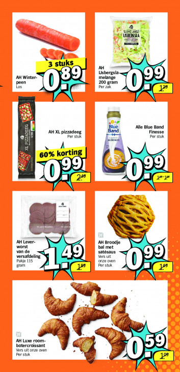 Deze tekst wordt automatisch gegenereerd, dus deze kan fouten bevatten.zi SLÄMELANGE " 5 3 stuks AH Winter- IJsbergsla. melange 99 peen 200 gram Los Per zak Blue Alle Blue Band 4) AH XL pizzadeeg Band Finesse LA > Per stuk Per stuk jokroom A R7 0% korting 4 6 99 and ep ern TN U No RUN D AH Lever- AH Broodje worst bal met van de satésaus 49 Vers uit 99 versafdeling onze oven Pakje 115 Per stuk gram JC" A PD # 4 2 v rn ze AH Luxe room- 2 botercroissant 59 Vers uit onze oven = Per stuk I» |
