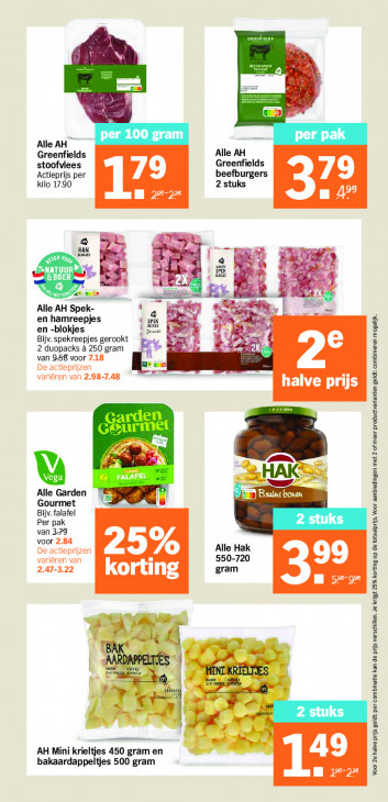 Deze tekst wordt automatisch gegenereerd, dus deze kan fouten bevatten.un: per 100 gram per pak Alle AH Greenfields Alle AH stoofvlees Greenfields Actieprijs per 79 beefburgers kilo 17.90 2 stuks | Er 2 HAM 7 ir) ET cor boe UI vez u es x” 7 2x 1 Ee tn ie Alle AH Spek- ES, a en hamreepjes sea PAZ en -blokjes echt Bijv. spekreepjes gerookt 2 duopacks à 250 gram res 2k van 958 voor 7.18 Eu 1 2° De actieprijzen variëren van 2.98-7.48 halve prijs Ls OST ei CRETE Alle Garden Brune book Gourmet Bijv. falafel Per pak 2 stuks van 379 voor 2.84 De actieprijzen 25% Alle Hak variëren van 550-720 99 2.47-3.22 gram korting LES À À AARDAPPELTES pun Ei y 2 stuks a y Pee + et adel I AH Mini krieltjes 450 gram en 49 bakaardappeltjes 500 gram Pl Voor 2e halve prijs geldt per combinatie kan de prijs verschillen. Je krijgt 25% korting op de totaalprijs. Voor aanbiedingen met 2 of meer productvarianten geldt: combineren mogelijk.