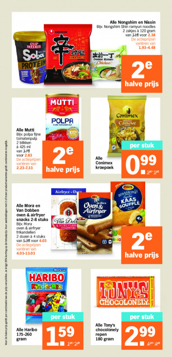 Deze tekst wordt automatisch gegenereerd, dus deze kan fouten bevatten.Alle Nongshim en Nissin Bijv. Nongshim Shin ramyun noodles NONGEHIM 2 zakjes à 120 gram van 348 voor un oT _ St SE; AY HAT 0 Demde Ramen < [N «I M Í [arte ES À À ER + —— — — — MUTTI DZ Conimex POLPA FUNÉTONATENPULE Ke ë Alle Mutti 2 Bijv. polpa fijne SN S tomatenpulp & GN hl 2 blikken à 425 ml per stuk van 378 voor Alle Conimex kroepoek TU Alle Mora en (02272 gourFLE Van Dobben oven & airfryer ® Airfryer er snacks 2-8 stuks 45 (LE Dols 2 Bijv. Mora a oven & airfryer > frikandellen BP 2 dozen à 4 stuks 0 van 538 voor — Er Inder: Sr Bd D: per stuk Alle Tony's Alle Haribo chocolonely 175-260 repen Voor 2e halve prijs geldt per combinatie kan de prijs verschillen. Je krijgt 25% korting op de totaalprijs. Voor aanbiedingen met 2 of meer productvartanten geldt: combineren mogelijk. gram 180 gram