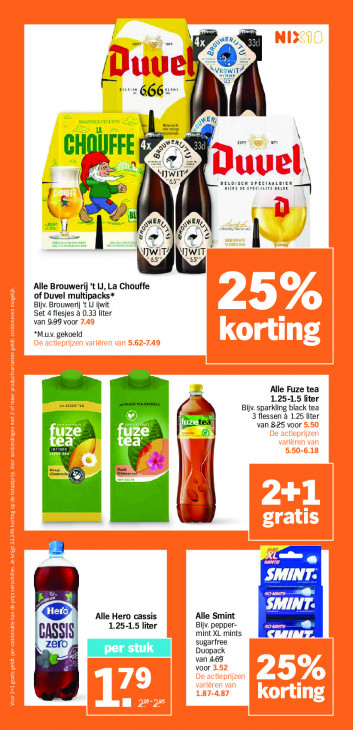 Deze tekst wordt automatisch gegenereerd, dus deze kan fouten bevatten.NE Sir S, VRIJWIT? villen Í D 666: HRASSERIE OUCUPES en n GE) Los zeen SN ER, ere en FFE a / 2 B WITZ 65 BELGISCH SPECIAALBIER Bizar DE SPÉCIALITÉ BELGE d 2) SMER, IER, ‘ \e NE) I WITZ N 65 Alle Brouwerij 't IJ, La Chouffe of Duvel multipacks* Bijv. Brouwerij 't IJ ijwit Set 4 flesjes à 0.33 liter van 999 voor *M.uv. gekoeld Alle Fuze tea Zu 1.25-1.5 liter wears Bijv. sparkling black tea 3 flessen à 1.25 liter van 825 voor uze uze ea ea er ven Peur = . | SMINT: CPR lite Alle Hero cassis Alle Smint 1.25-1.5 liter Bijv. pepper- sour CASSIS mint XL mints zero sugarfree Duopack van 469 voor