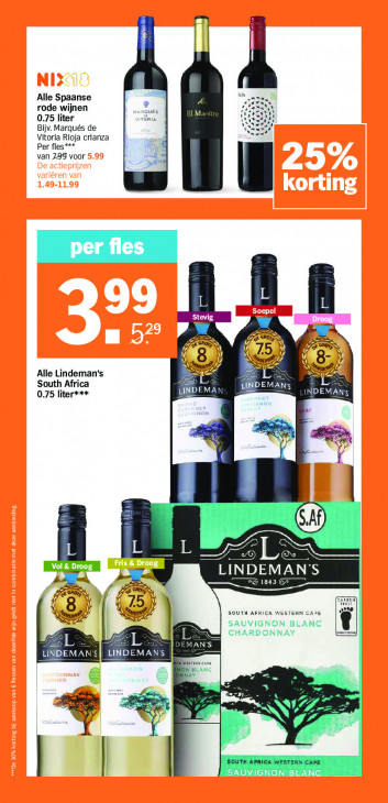 Deze tekst wordt automatisch gegenereerd, dus deze kan fouten bevatten.| Ci Alle Spaanse rode wijnen QUÉS 0.75 liter Tama a HM À Hi Î 5 Bijv. Marqués de 5 “ Vitoria Rioja crianza Per fles*** van 299 voor Stevig PS LS GROEN, M ( N Ke KS 8) Alle Lindeman’s 24 nen South Africa LINDEMAN u AU s NDEMA 0.75 liter*#* Ÿ wi | me Vol & Droog PY ANS 84 ZERO SOUTH AFRICA WESTERN CAPE Gems SAUVIGNON BLANC CHARDONNAY TE LINDEMANS LINDEMAN: 2 #2 SAUVIGNON BLA