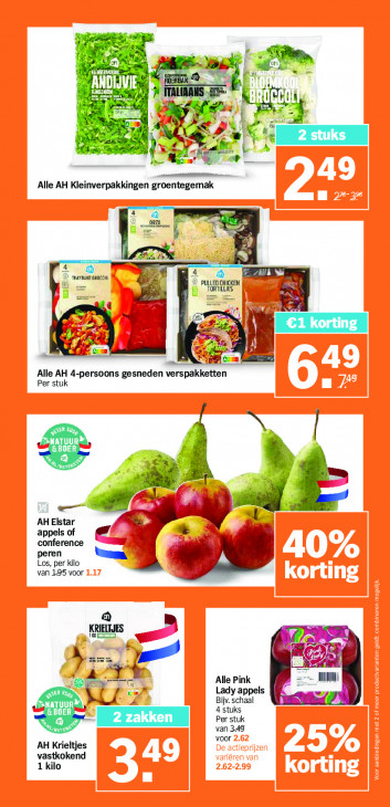 Deze tekst wordt automatisch gegenereerd, dus deze kan fouten bevatten.Ir AAL en ae _ na x x 4 NOD | Alle AH Kleinverpakkingen groentegemak = RE N m #4. ET Te} AYBAKE GHDCCH © p Y ORTILLAS LED CHICKEN 8 | N x sl © © (C7 ++ ee Alle AH 4-persoons gesneden verspakketten Per stuk LA LT EG : 3 CED fi AHElstar appels of conference peren 3 Los, per kilo van 195 voor KRIELTJES z Sn Ze Alle Pink mM ET Lady appels COUT Bijv. schaal 4 stuks Per stuk TE ch van 349 voor vastkokend AH Krieltjes 1 kilo