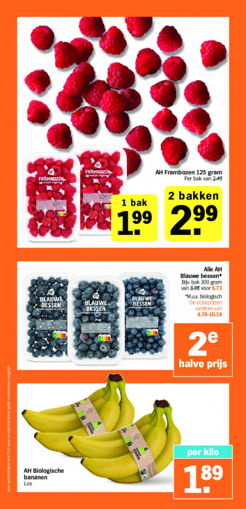 Deze tekst wordt automatisch gegenereerd, dus deze kan fouten bevatten.» y a zl 4 = LA 15 AH Frambozen 125 gram 11 5 Per bak van 249 De tr 2 bakken 1 bak M 1% 27° Alle AH Blauwe bessen* PG Bijv. bak 300 gram van 8-98 voor en NS BLAUWE: *M.uv. biologisch ES PAT „ Li Br an = N N a? RL a a AH Biologische bananen Los