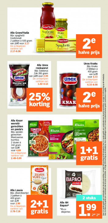 Deze tekst wordt automatisch gegenereerd, dus deze kan fouten bevatten.| a LT 2 ea Alle Grand'italia Tradi Re Oo Bijv. spaghetti IE tradizionali 2 pakken à 500 gram van 290 voor Sp: ohelli Unox Knaks Alle Unox Bijv. Knaks rookworst 2 blikken à Bijv. Gelderse 400 gram Zak 285 gram van 578 van 399 voor voor (Unox rookworst = Perte Alle Knorr wereld- Ron gerechten Knorr en pasta's Bijv. wereld- il Kor dt: per combinatie kan de prijs verschillen. Je krijgt 33.34% korting op de totaalprijs. zi gerechten Mexicaanse PENNE ú burritos En teln 30% 2 dozen à ee 07 342 gram BA ee, van 938 ar voor a + krijgt 50% korting op detotaalprijs Voor 241 grati Je krijgt 25% korting op de totaalprijs. Voor aanbiedingen met 2 ofmeer productvarlanten geldt: combineren mogelijk. Le BAPAO Alle Lassie Bijv. zilvervliesrijst 3 pakken à 400 gram 2 stuks van 435 voor Alle AH Bapao* *M uv. diepvries Voor 11 gratis geldt: per combinatie kan de prijs ver Voor 2e halve prijs geldt per combinatie kan de prijs ver