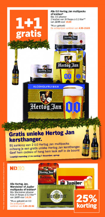Deze tekst wordt automatisch gegenereerd, dus deze kan fouten bevatten.Alle 0.0 Hertog Jan multipacks of kratten* Bijv. 0.0 pilsener 2 kratten van 24 flesjes à 0.3 liter** van 39-98 voor *M.uv. gekoeld m D, Le ET “u In 00 16) su Es ALCOHOLVRIJ BIER == _- nr 2 Re: Eau en % Gratis unieke Hertog Jan 3, kersthanger. Bij aankoop van 2 0.0 Hertog Jan multipacks tis unieke Hertog Jan kersthanger. | ntvang je een gra PE | Geef hem cadeau of hang hem leuk zelf in de boom! Looptijd maandag 1 t/m zondag 7 december. op=op gear CNT RE É &) luviler Alle Hertog Jan, Warsteiner of Jupiler = (LA multipacks of kratten* Bijv. Warsteiner pilsener ds. van 1899 voor Krat 24 flesjes à 0.3 liter** Jarstein *M.uv. gekoeld en 0.0 Rue in