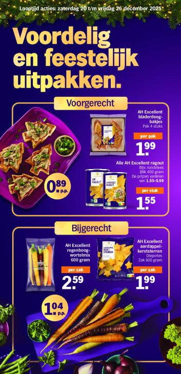 Deze tekst wordt automatisch gegenereerd, dus deze kan fouten bevatten.IDE aterdag 20 t/ FOR ER AU Kg + %7 cs AA LE en feesteliik uitpakken. Voorgerecht AH Excellent bladerdeeg- bakjes Pak 4 stuks % #7 fe Br EUR, œ 12° 4 Alle AH Excellent ragout Bijv. rundvlees Blik 400 gram De prijzen variëren 89 van 1.55-5.99 LL ee | 1 Bijgerecht er —— AH Excellent AH Excellent regenboog- ser af | OS Eu aardappel- wortelmix st N Diepvries 600 gram Zak 600 gram 99 59 — n 04 „pp, TS Lx PN an [La | 3 ee 2 « D. D u MH ss.