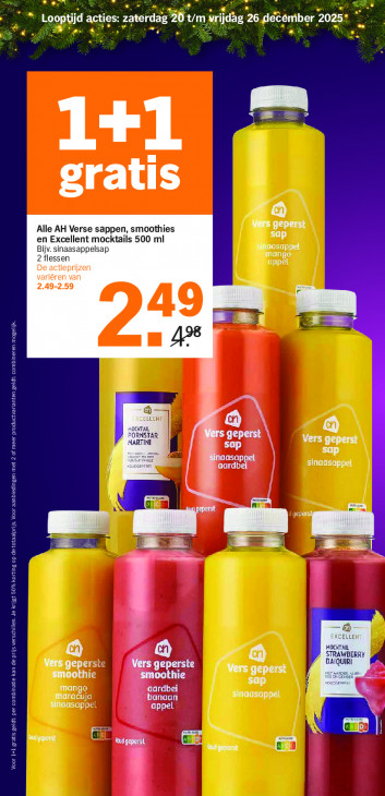 Deze tekst wordt automatisch gegenereerd, dus deze kan fouten bevatten.rdag 20 tm ICE ET DE ur . Looptid agkies: LS a ‘ el en = 1+1 gratis Ea Alle AH Verse sappen, smoothies rde an en Excellent mocktails 500 ml sap UOTE NI 2 flessen Bijv. sinaasappelsap et De prijzen appel ren van 2.49-2.59 49 Li m4 Ti INL ORNSTAR geperst MARTINL aasappel sinaasappel aardbei DES wu EL > _ RTAIL Æ 'AWBERRY Vers geperste smoothie oothie Vers geperst mango aardbei sap 4 Maracuja tet] Sinaasappel tes CUS üm ATO) red nn LUTTE Wa Voor 1+1 gratis geldt: per combinatie kan de prijs verschillen. Je krijgt 50% korting op detotaalprijs Voor aanbledingen met 2 of meer praductvarlanten geldt: combineren mogelijk.