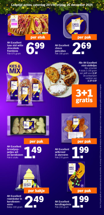 Deze tekst wordt automatisch gegenereerd, dus deze kan fouten bevatten.PL ie terd: er 2025 es; EE Ke WER gn. 2 F EIN LER LUXE W À 4, Fed LUE luxe stol witte AH Excellent chocolade choco HE pancakes A Pak 675 gram 62° Pak 180 gram Alle AH Excellent KIES & LE LE TES PR ijv. amandel MIX ; D 4 stuks à 100 gram Em KEER (oled A k De actieprijzen variören van 2.37-5.97 ne ei (CC d =. mo AH Excellent AH Excellent broodpop- petjes wit witbrood 99 GLEN in stervorm Pak 6 stuks | ou Pak 270 gram | |] KERST llen. Je ontvangt 25% korting op de totaalprijs. Voor aanbiedingen met 2 of meer productvarlanten geldt: combineren mogelijk. HAGEL I 11e AT À AH Excellent roomboter in kerstboom- AH Excellent 99 vorm sé kersthagelmix Voor 341 gratis geldt: per combinatie kan de pı Bakje 100 gram Pak 200 gram