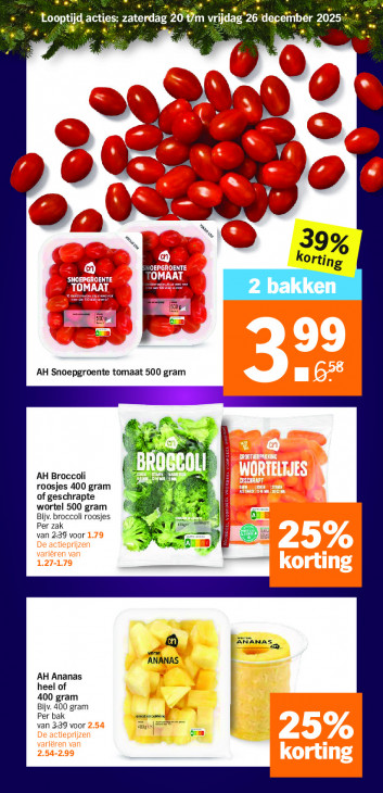 Deze tekst wordt automatisch gegenereerd, dus deze kan fouten bevatten.ar) actie e S: ee Rn LL 2025 " ñ DD Jl hd © 3 J > 9 dele _ % > 39% on on korting ij Ha + 2 bakken db Ee Br ü LT pe Le: AH Snoepgroente tomaat 500 gram AH Broccoli a roosjes 400 gram of geschrapte Jt wortel 500 gram 3 3 Per zak Bijv. broccoli roosjes Die van 239 voor ej ANANAS, er ANANAS AH Ananas heel of 400 gram Bijv. 400 gram Per bak gro van 3-39 voor we où