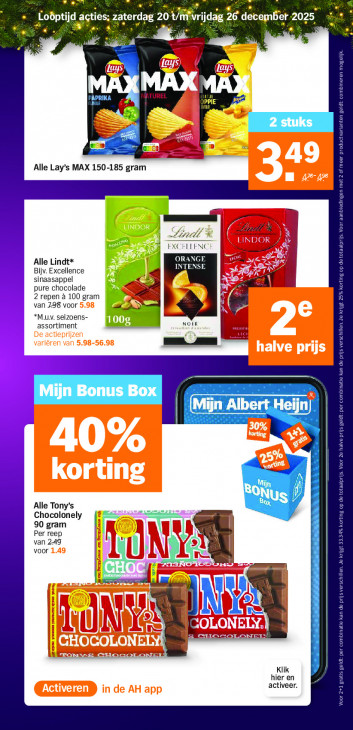 Deze tekst wordt automatisch gegenereerd, dus deze kan fouten bevatten.Loö PEN PL act! dag 26 december 20 I 4 Pur 14413 2 stuks Bi a En = Alle Lay’s MAX 150-185 gram Sind 3 EXCELLENCE Alle Lindt* Bijv. Excellence sinaasappel pure chocolade 2 repen à 100 gram van 798 voor B ré *M.uw. seizoens- assortiment Kd NOIR mn | Mijn Bonus Box (Mijn Albert. Heljn) Mijn Alle Tony's Bop Chocolonely 90 gram Per reep K van 249 voor Po Np Ex È Klik hier en activeer.