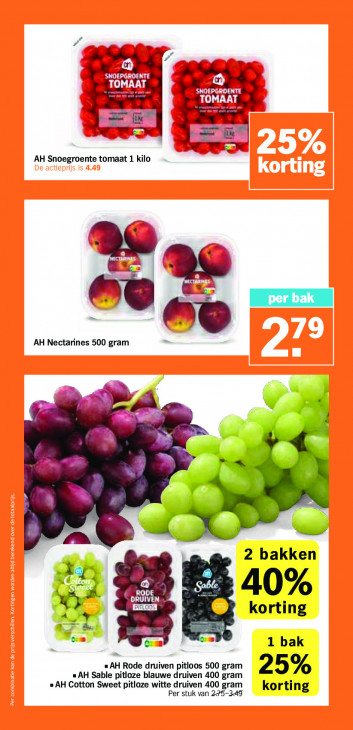 Deze tekst wordt automatisch gegenereerd, dus deze kan fouten bevatten.rn a Mi EL Sem “lu Sm ZI re it AH Snoegroente tomaat 1 kilo 60 AH Nectarines 500 gram zi, = Ee, Di D De LA sr ae) 2 bakken EE RODE 40% KALE, korting > LE 1 bak = AH Rode druiven pitloos 500 gram 25% = AH Sable pitloze blauwe druiven 400 gram = AH Cotton Sweet pitloze witte druiven 400 gram Per stuk van 25-34 korting