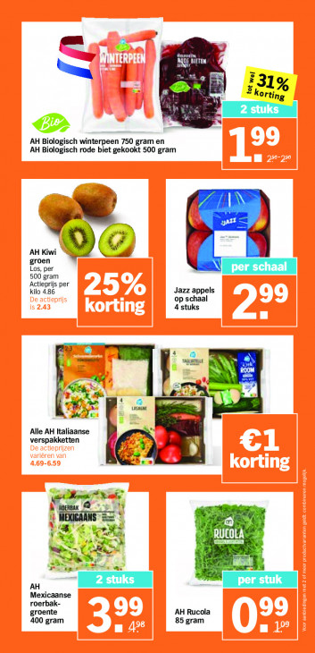 Deze tekst wordt automatisch gegenereerd, dus deze kan fouten bevatten.= in Ft: SL Pa: 31 8 korting CA = AH isch winterpeen 750 gram en AH Biologisch rode biet gekookt 500 gram Nd x AH Kiwi G 4 groen Los, per 500 gram Actieprijs per kilo 4.86 Jazz appels op schaal 4 stuks an DE k. dede Alle AH Italiaanse verspakketten je Kai, er ER Se à TN Ä 5 Ci AH Mexicaanse roerbak- groente AH Rucola 400 gram 85 gram