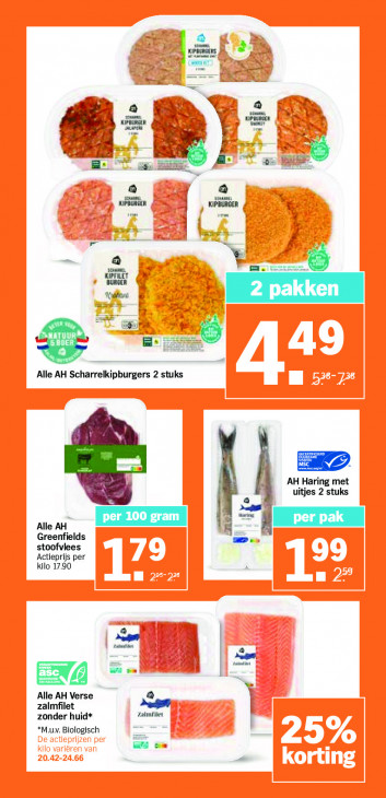 Deze tekst wordt automatisch gegenereerd, dus deze kan fouten bevatten.= Br ken mie AG % > nen = r ar il À de EEE u, KIPBERGER aa ja À | 2pakken | en FAT Es ra Alle AH Scharrelkipburgers 2 stuks Cl NA) AH Haring met uitjes 2 stuks © Marin Alle AH Greenfields stoofvlees Actieprijs per kilo 17.90 | À cames Pe zee eu EN Alle AH Verse zalmfilet zonder huid* zalmfilet *M.uv. Biologisch rs on