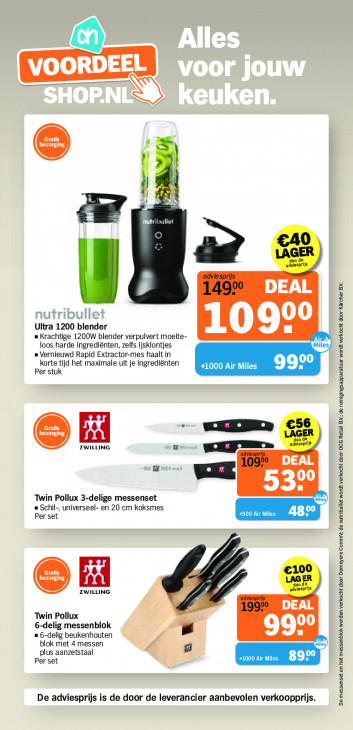 Deze tekst wordt automatisch gegenereerd, dus deze kan fouten bevatten.WE CS bezorging | de DEAL Ultra 1200 blender 1092 = Krachtige 1200W blender verpulvert moeite- loos harde ingrediënten, zelfs ijsklontjes = Vernieuwd Rapid Extractor-mes haalt in korte tijd het maximale uit je ingrediënten +1000 Air Miles 9920 Per stuk CS = CR ER ZWILLING wen DEAL a “ : a 2 Twin Pollux 3-delige messenset «Schil-, universeel- en 20 cm koksmes +500 Air Miles 48° Per set ES bezorging | ZWILLING DEAL Twin Pollux 6-delig messenblok =6-delig beukenhouten LE Hi blok met 4 messen plus aanzetstaal Per set EC BIO De adviesprijs is de door de leverancier aanbevolen verkoopprijs. De messenset en het messenblok worden verkocht door Demeyere Comm de nutribullet wordt verkocht door OCG Retall BV de reinigingsapparatuur wordt verkocht door Kärcher BV.